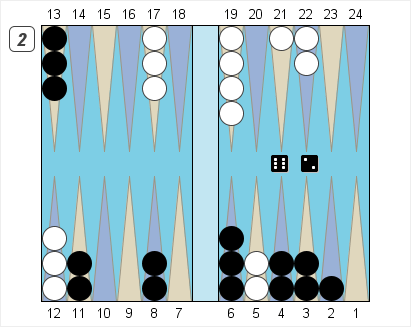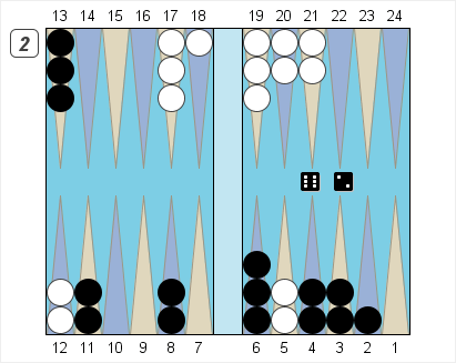 There’s another play to consider, however. It’s 13/7 4/2. Black leaves a blot on his bar-point which White can hit with a deuce. If White misses, however, Black’s game is better in every respect. He’s kept the 8-point as a landing spot, and next turn he’ll have several rolls, like 6-5 and 4-3, which make the 7-point while clearing one of his troublesome outer points.