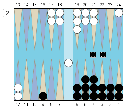 In this position, Black has closed out one checker and escaped all his men from behind White’s prime. The win is nearly certain, and he has some substantial gammon chances. With a 4-4 to play, Black has three choices: